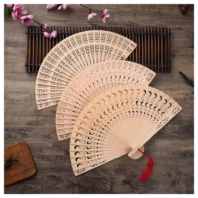 Ekspert laget av naturlig bambus, hver vifte viser intrikate utskårne mønstre og glatte finisher som fremkaller tradisjonell eleganse. En perfekt blanding av funksjonalitet og estetikk, ideell for fester med vintage-tema, utendørs bryllup eller kulturelle begivenheter.