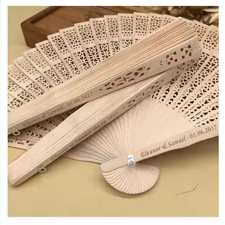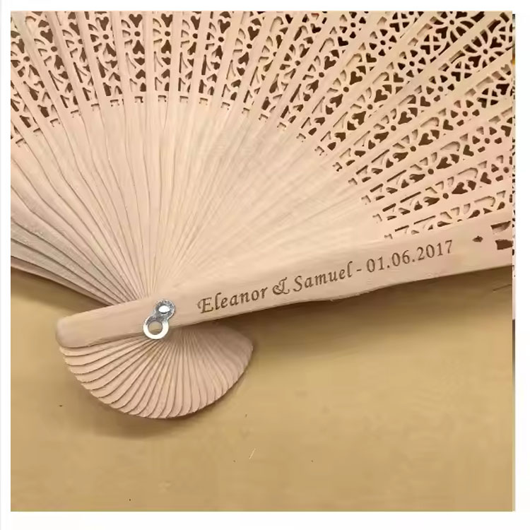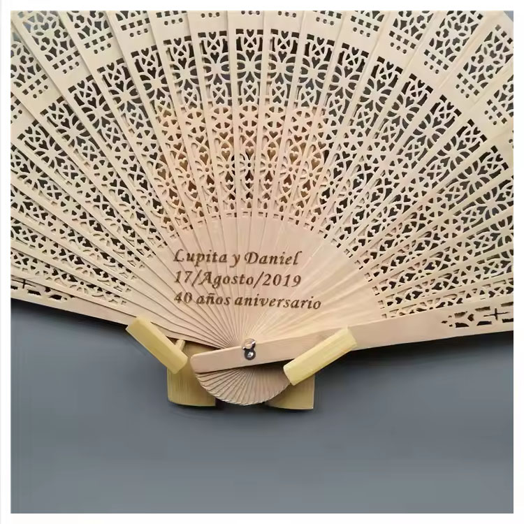 Tilpass viften med navn, arrangementsdato, logo eller meningsfylt budskap gjennom høykvalitetstrykk eller lasergravering. Et gjennomtenkt og varig minnesmerke for gjester eller kunder, designet for å matche arrangementets tema eller merkeidentitet.