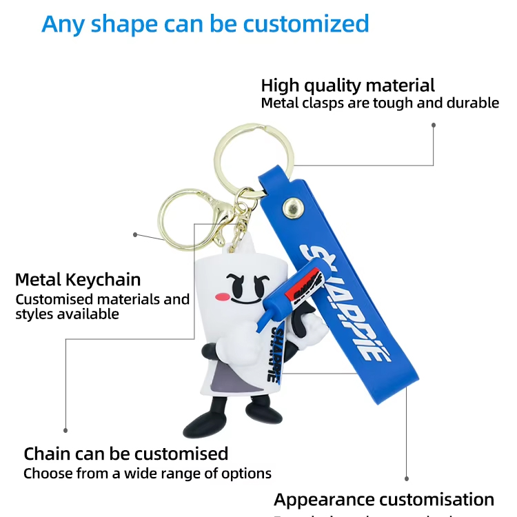 Gjør merkevaren din eller ideen din til live med fullt tilpassede 2D- eller 3D-design. Enten det er en logo, maskot eller slagord, våre myke PVC-nøkkelringer er skreddersydd for å matche din visjon med levende farger og høye detaljer.