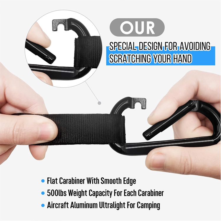 Inkluderer to 10 fots justerbare trestropper med 15+ løkkepunkter og militærkarabiner i aluminium, som muliggjør sikker installasjon på trær 12 til 25 fot fra hverandre uten å skade barken.