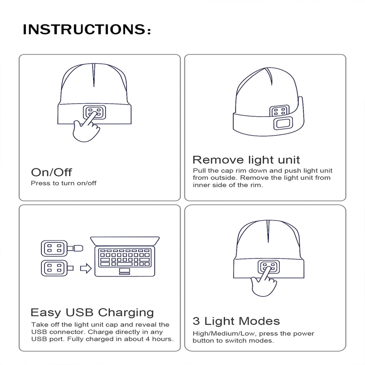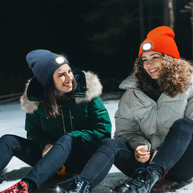 Oppladbar, håndfri LED-hodelykt, strikket nattlys. Lys opp nettene dine med vår innovative LED-hettelys. Denne oppladbare hodelykthatten har en komfortabel strikket design for både menn og kvinner. Med håndfri belysning er den den perfekte følgesvennen for nattløp, camping eller andre oppgaver som krever sterkt, fokusert lys.