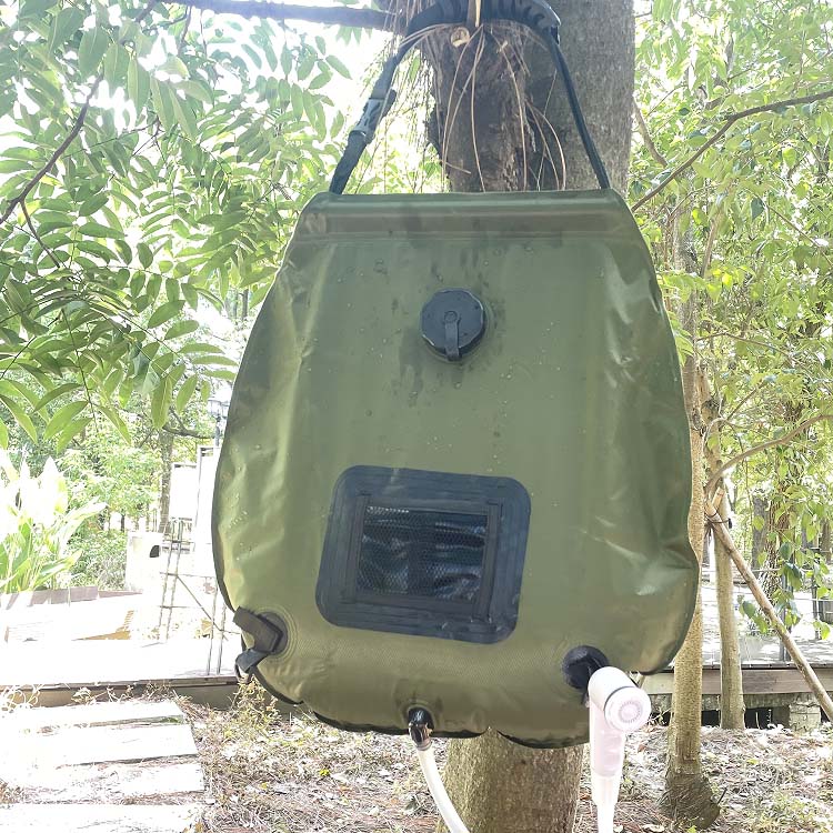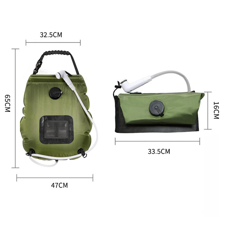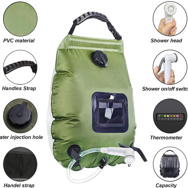 Solar bærbar dusj Camping Varme Camping Dusj Bag. Din ultimate bærbare hygieneløsning for utendørs eventyr. Denne solardusjposen gir 5 gallons/20L varmevann for campingkomfort. Ved å utnytte solenergi sikrer den en varm, forfriskende dusjopplevelse hvor som helst i villmarken.