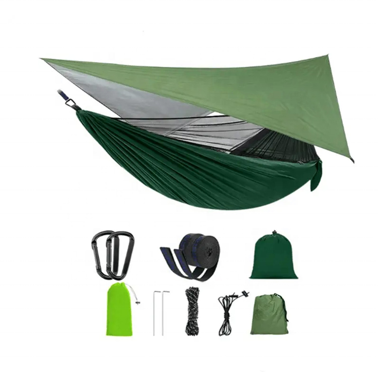 Ultra Light Swing Camping Myggnett Regn Fluehengekøye.Din ultimate allværshengekøyeløsning for utendørseventyr. Dette ultralette systemet kombinerer en komfortabel svinghengekøye med integrert myggnett og beskyttende regnflue. Perfekt for camping, det sikrer feilfri avslapning og tørr komfort under forskjellige forhold.
